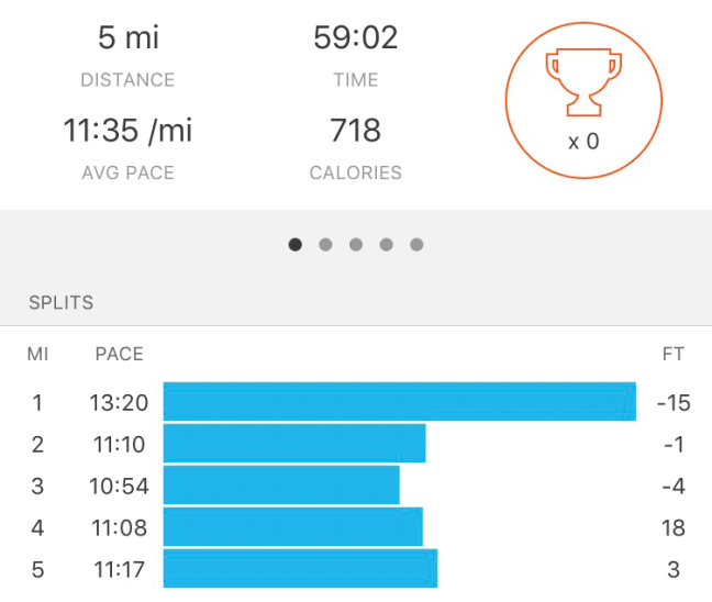 My first mile was a bit slow but each successive mile was a bit quicker. I had to slow my roll a little bit st mile three when I realized I was hammering the pavement at a sub-11 minute pace. I didn’t want to risk injuring myself further, however I did set my goal of finishing in under an hour.